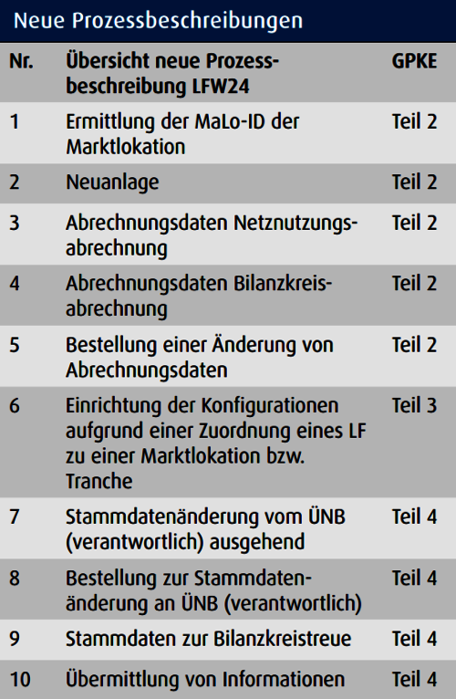 Wenngleich die Anzahl der Prozesse gesunken ist, so haben sich die bestehenden Prozesse signifikant verändert (Tabelle 1). Neben zehn neuen Prozessen gibt es wesentliche Änderungen bei den Zuordnungsprozessen (GPKE, Teil 2) und den Stammdatenprozessen (GPKE, Teil 4).